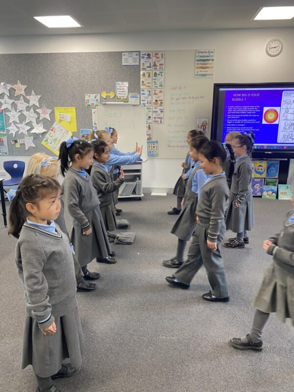 Role playing is a favourite way for many students to practise some of the strategies they are learning. The Preps explored how big their personal space bubble is with their friends and then with ‘pretend’ strangers.