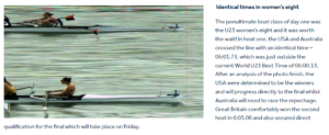 Have a look at how close the U23W8+ finish was in the attached photo. Identical times but separated by the narrowest of margins. Both crews only 1.5 seconds off the world’s best time so expect some exciting racing in the finals.
