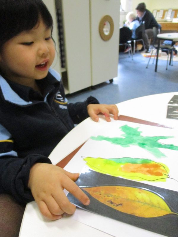 The Waratah Room children were invited to paint with autumnal coloured dyes as a means of observing and considering natural stimuli. As a group, the children and their teachers continue to discuss items from nature that have been found outside during play experiences.