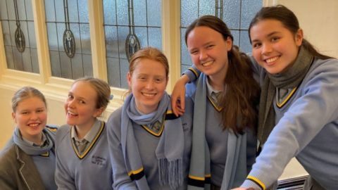 C’est si bon! Students Ruby Wake, Madeline (Maddie) Powell, Eloise Rudge, Charlotte Myer, and Lan-Tian Yen-West celebrate their Berthe Mouchette Alliance Française success